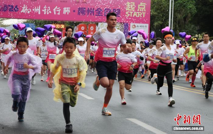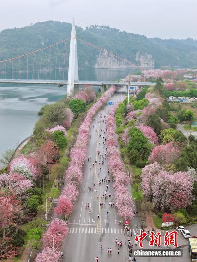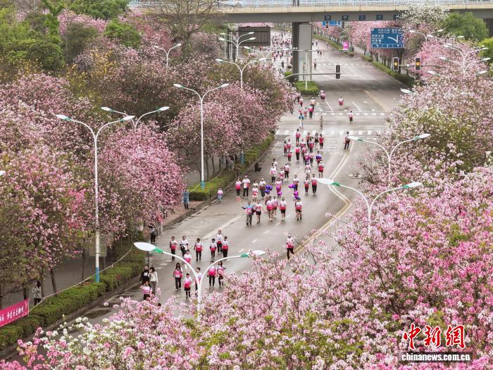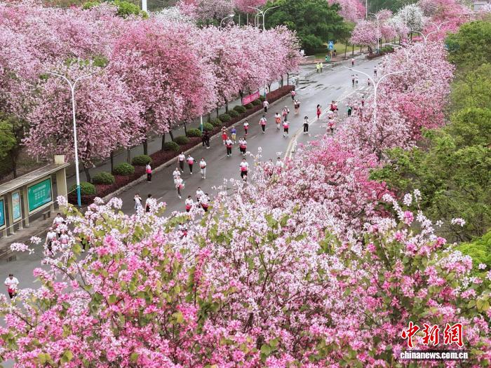 图为公众正在花海停跑步。(无人机像片)赛事组委会供图