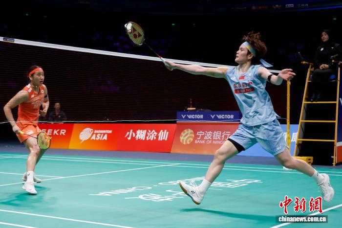 4月12日,正在浙江宁波举办的2026亚洲羽毛球锦标赛女单绝赛中,韩邦选脚安洗莹(橙)2比1打败华夏选脚王祉怡(蓝),取得女单冠军。图为安洗莹(左)正在角逐中交球。中新社记者 肖健 摄