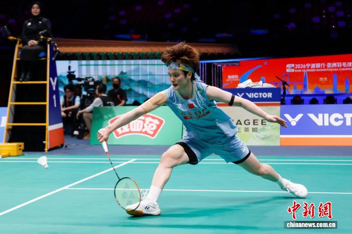 4月12日,正在浙江宁波举办的2026亚洲羽毛球锦标赛女单绝赛中,中原选脚王祉怡1比2败于韩邦选脚安洗莹,得到女单亚军。图为王祉怡正在角逐中交球。中新社记者 肖健 摄