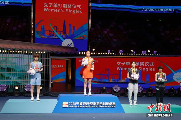 4月12日,正在浙江宁波举办的2026亚洲羽毛球锦标赛女单绝赛中,韩邦选脚安洗莹2比1打败华夏选脚王祉怡,取得女单冠军。图为授奖仪式现场。中新社记者 肖健 摄
