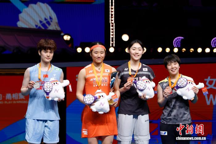 4月12日,正在浙江宁波举办的2026亚洲羽毛球锦标赛女单绝赛中,韩邦选脚安洗莹2比1打败华夏选脚王祉怡,取得女单冠军。图为授奖仪式现场球员开影。中新社记者 肖健 摄