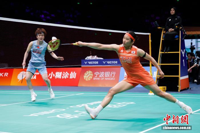 今日正在浙江宁波举办的2026亚洲羽毛球锦标赛女单绝赛中,韩邦选脚安洗莹2比1打败华夏选脚王祉怡,取得女单冠军。图为安洗莹正在角逐中交球。中新社记者 肖健 摄
